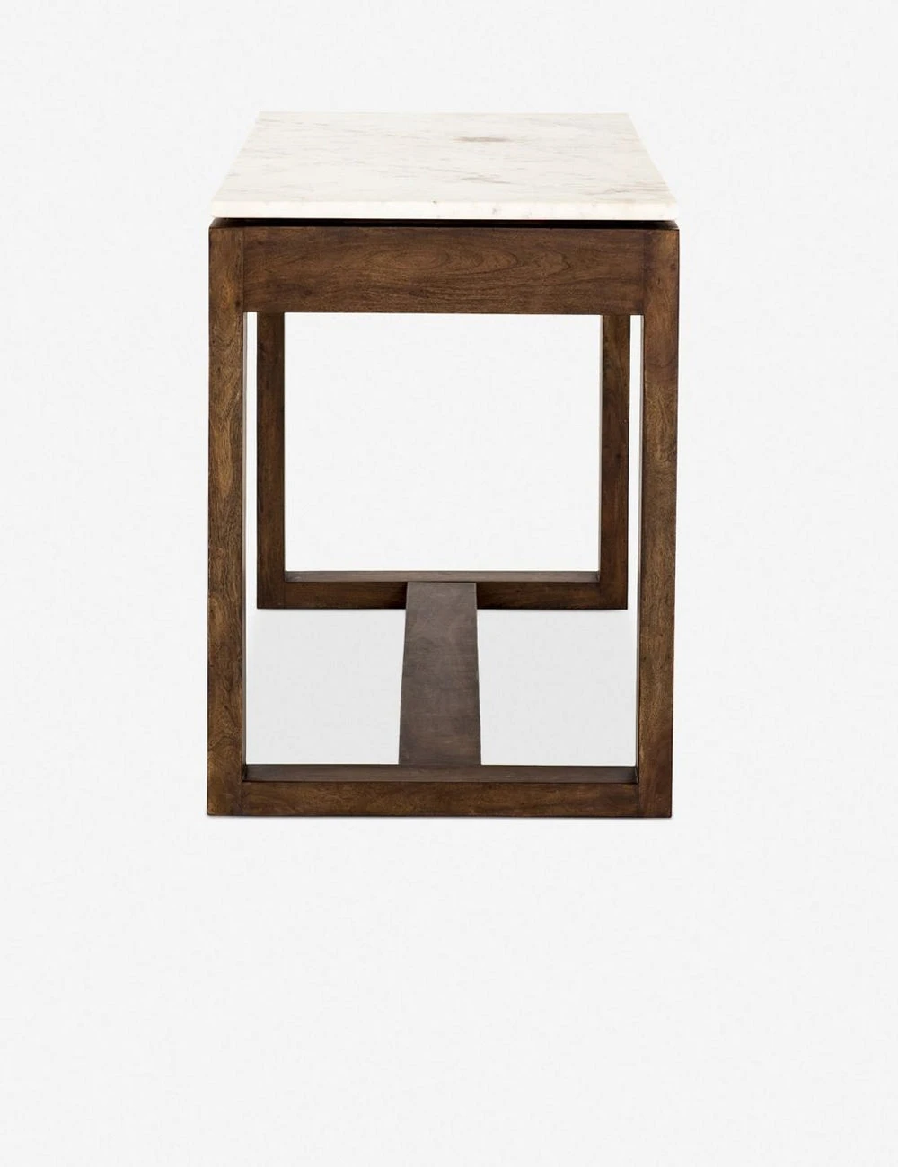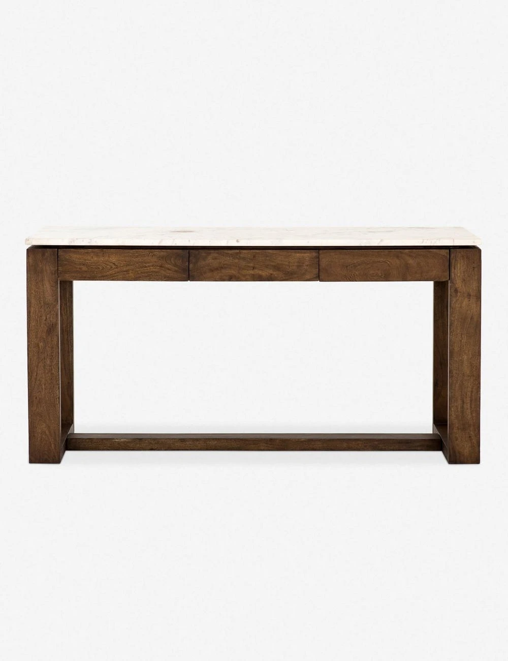 This functional counter table can easily double as a kitchen island, thanks to three storage drawers on each side and a white marble top. The solid brown acacia wood makes this piece a versatile addition to any kitchen!