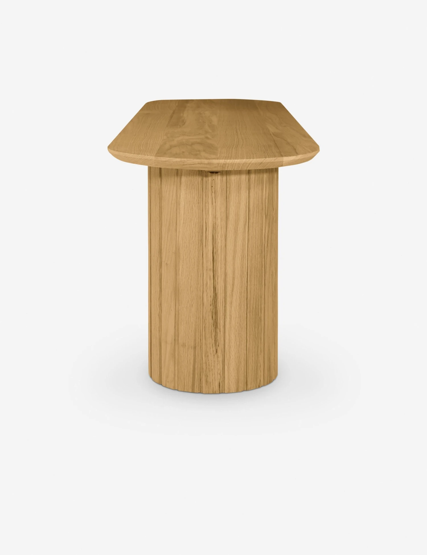 Create an elegant place to land with this solid wood dining bench. An oval seat sits atop two pillar legs with subtle ribbing accentuating its elemental form. We love the transitional appeal of this modern bench, whether styled in your dining room or entryway hall.