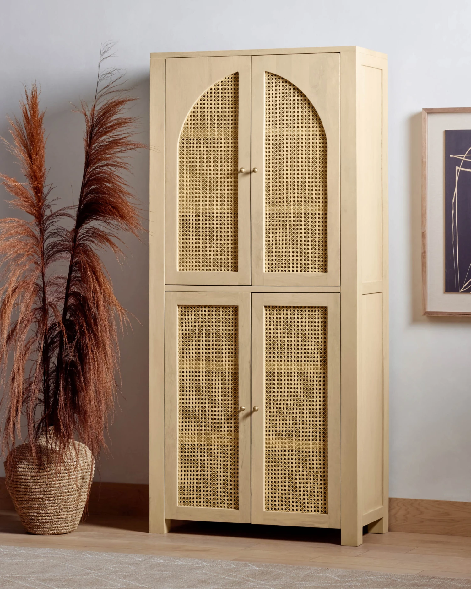 Arched cane panels bring a vintage-inspired look to this wood cabinet, making it the perfect transitional storage piece. With iron pulls and spacious shelving inside, this cabinet grounds your dining room or lounge with a practical touch and timeless feel.