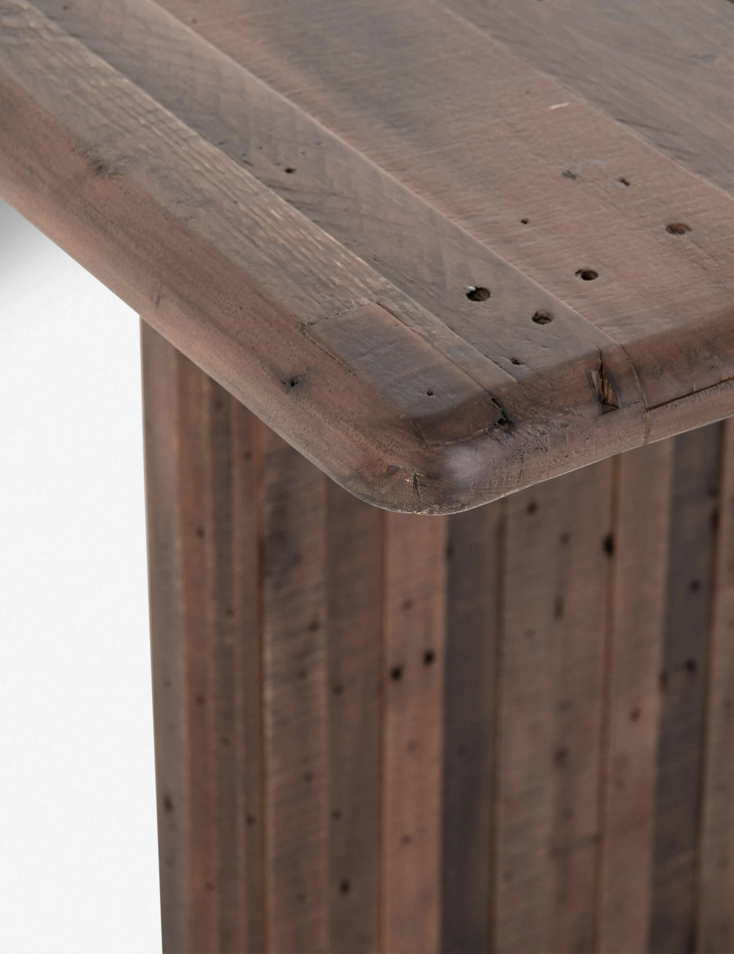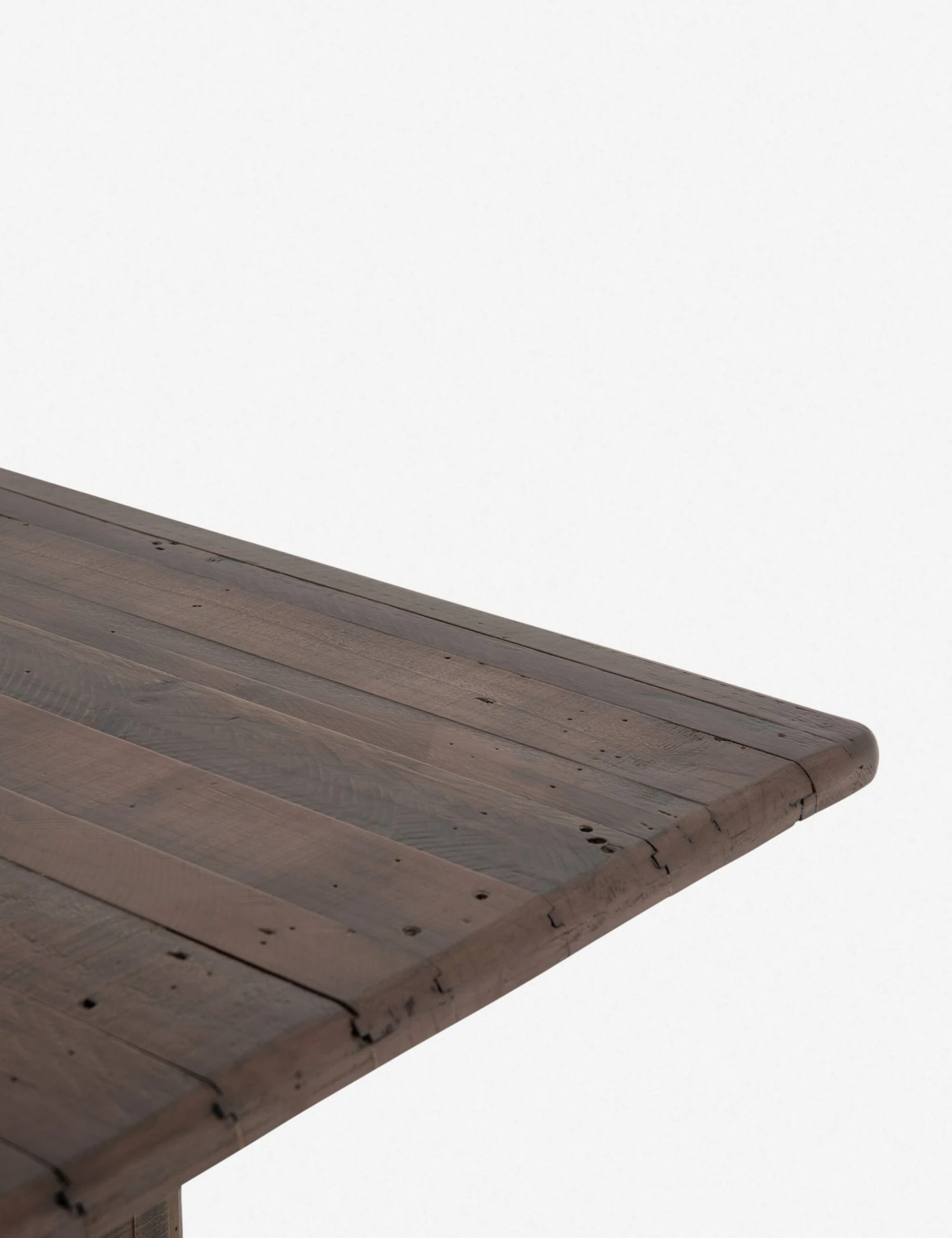 Rough-hewn joints and artisanal touches lend this ten-person dining table rustic appeal. The natural graining and knots of the reclaimed wood ground this design with an organic texture. We love the moody tones and antique-inspired character this wooden dining table has to offer to a richly layered dining room look.
