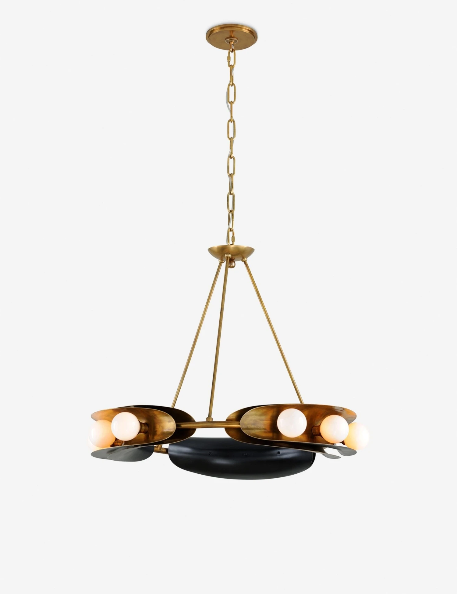 Old Hollywood glamour meets 1920s charm with this bold chandelier. The balanced design features nesting curves, vintage-inspired finishes, and globe-shaped diffusers for a look that will earn you compliments at every dinner party.