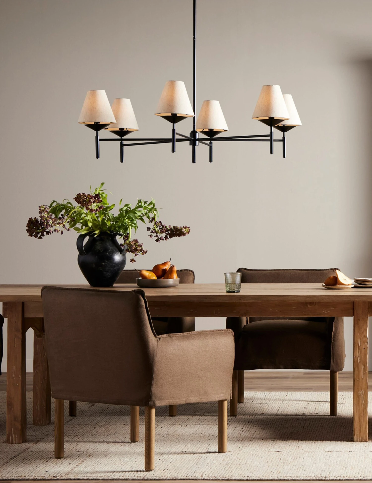 The Marisol chandelier bends traditional notes in a modern design to offer the perfect lighting element for transitional decor. A black finish accentuates the slim iron frame, with tapered beige shades for an elegant touch. Style this large chandelier dining room to lounge for understated impact overhead.