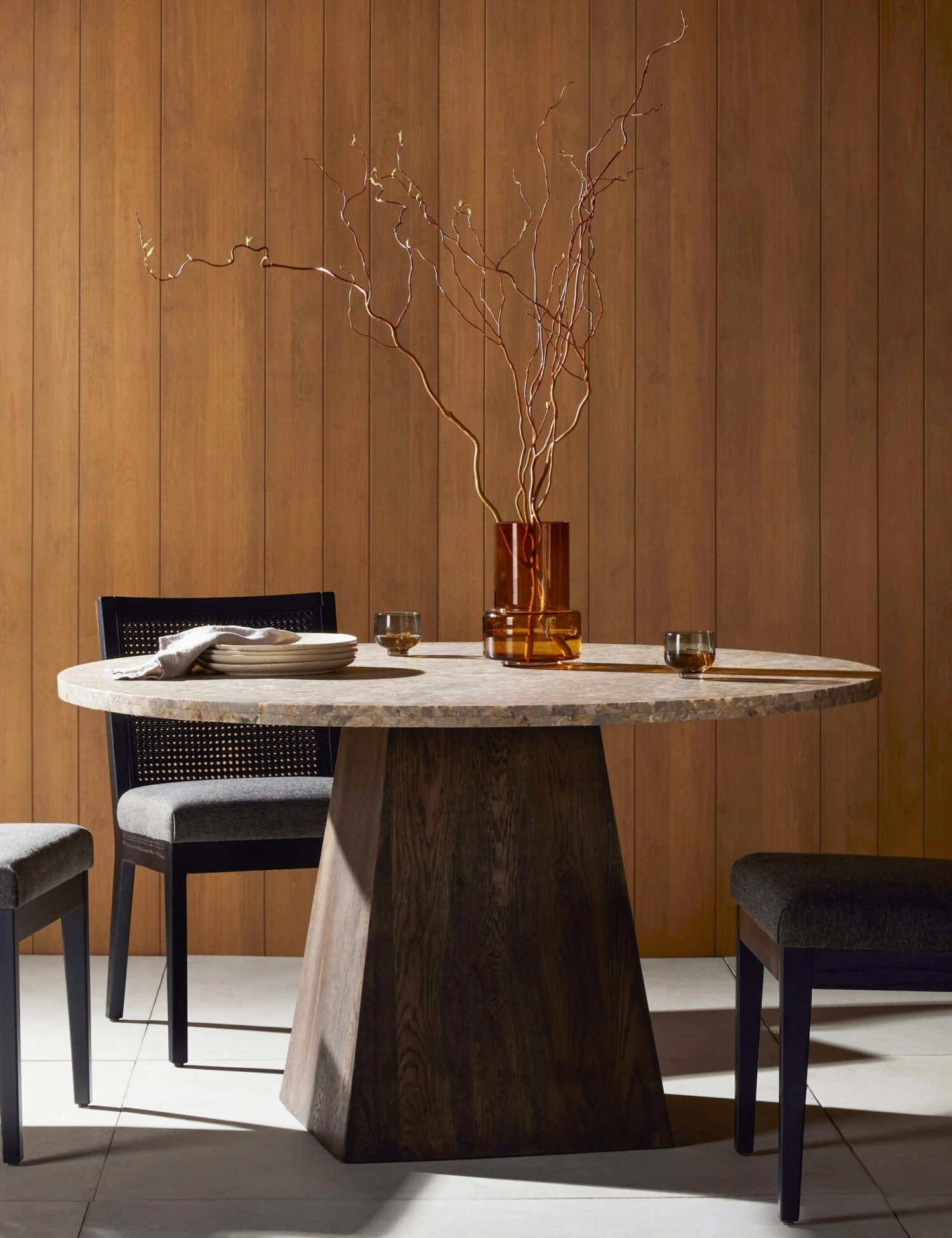 The Olena dining table offers a grounding impact with its elemental shape. The clean lines of the tapered pillar base support the stone top with a sturdy bearing that strikes a sculptural silhouette. With room for six, this round table is the perfect anchor piece for an artfully modern dining curation.