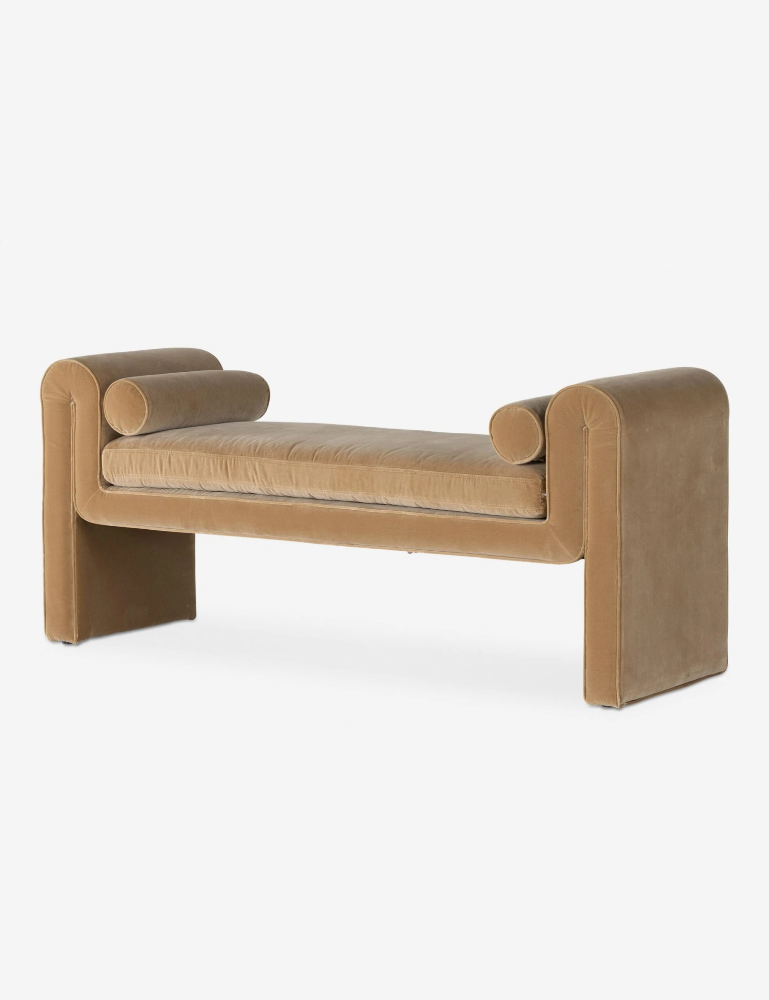 Set your space for streamlined sophistication with this stylish accent bench. Soft, upholstered lines gently curve and fold into a modern bench seat, offering a trend-forward look with timeless appeal. The clean and balanced profile blends linear elements with rounded edges and cylinder cushions for a plush yet airy design.