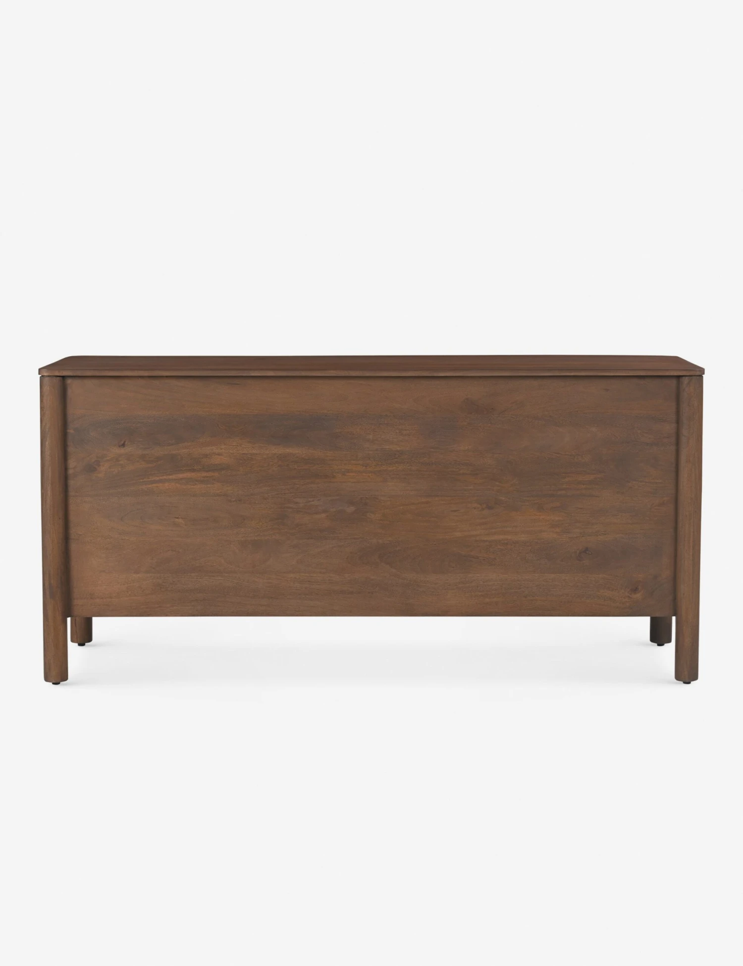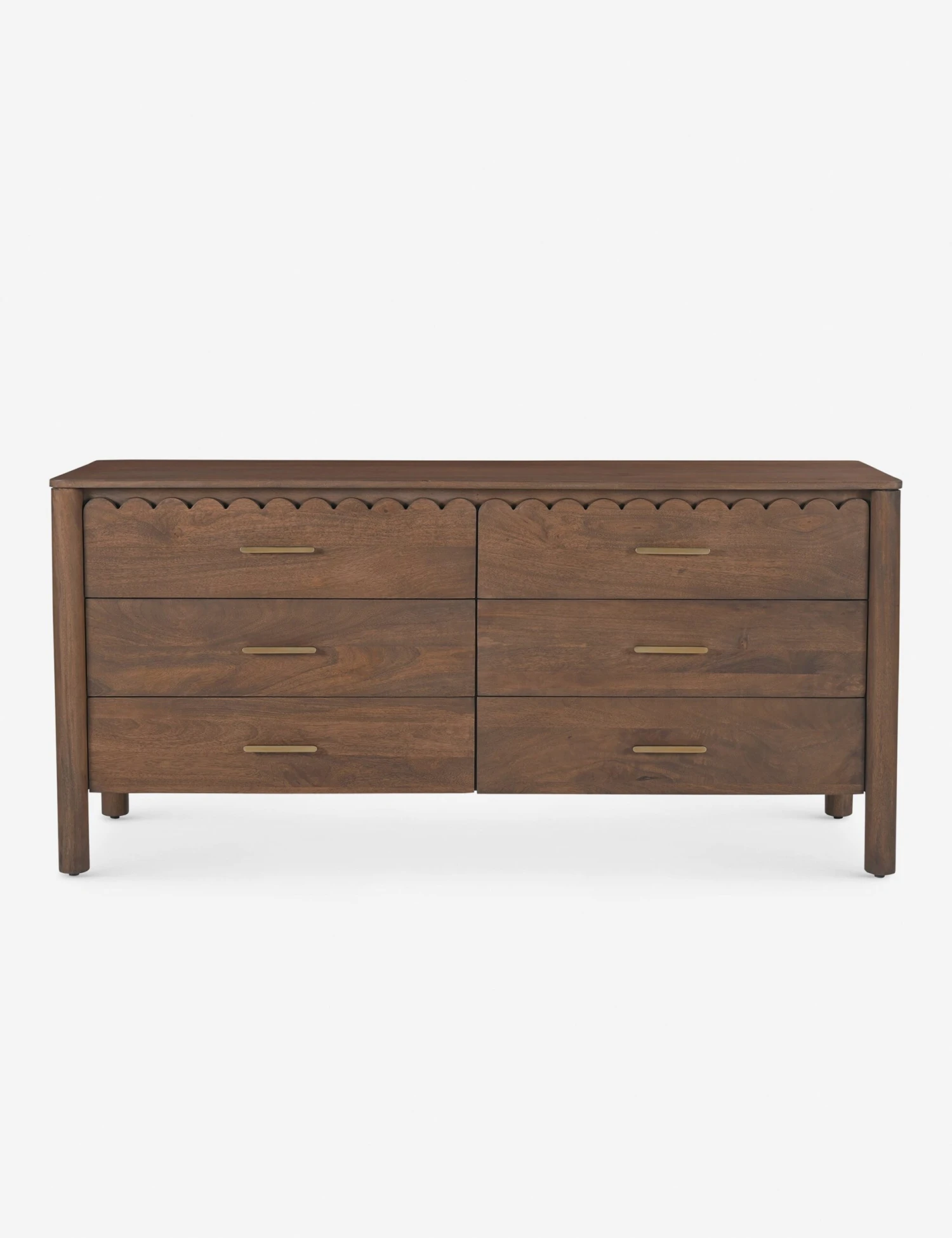 The Samantha dresser grounds modern appeal in natural grain warmth and charm. The clean-lined frame is adorned with scalloped detailing and brass-finished hardware, setting off its profile with a unique touch. Six drawers bring spacious storage to this long, low dresser.