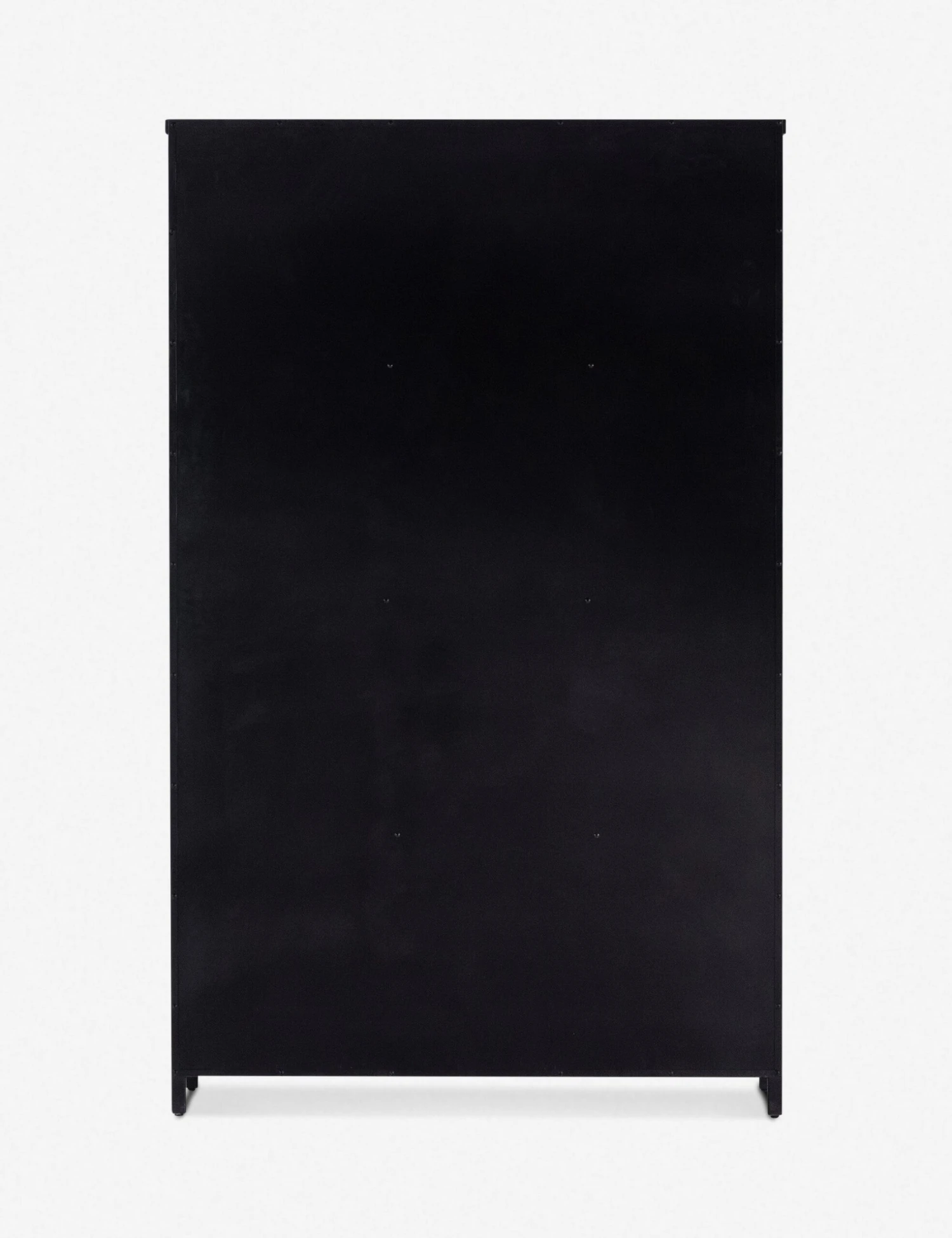Window paneling balances the industrial notes of this large-scaled iron cabinet with a traditional style and open feel. Understated design and a black finish create a versatile element for a living space or home office, offering spacious storage and a sleek backdrop for accent decor.